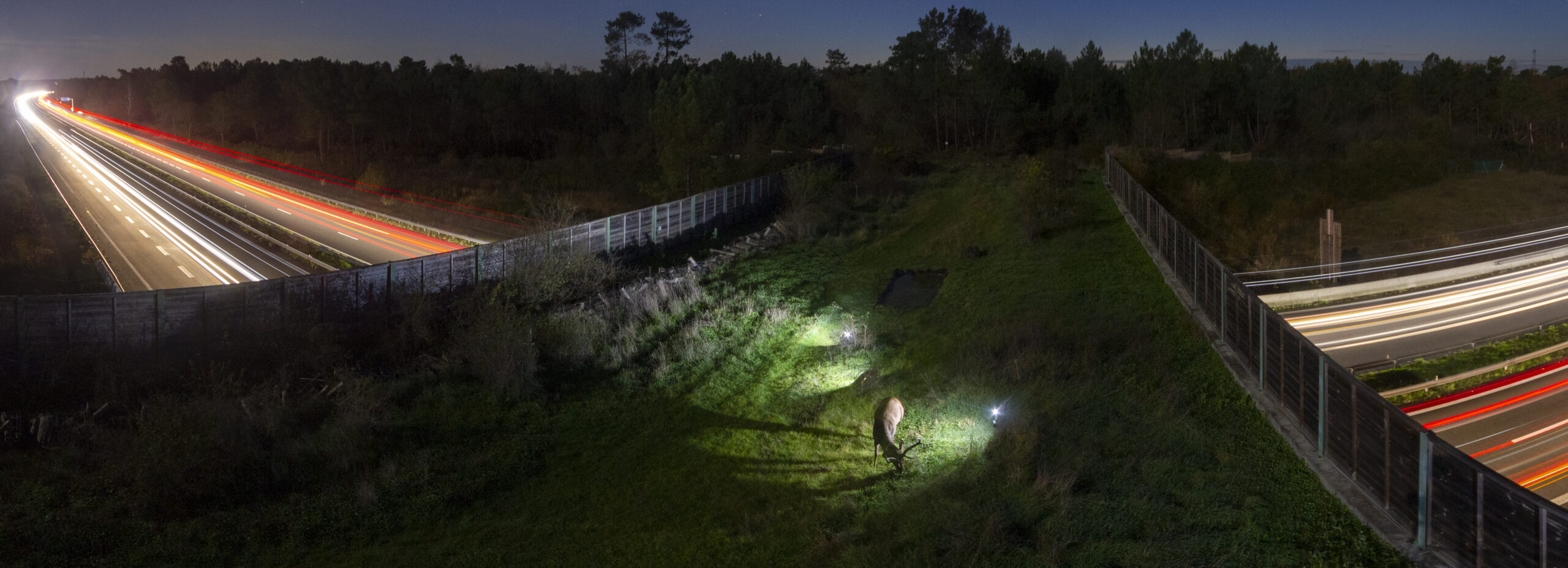 A wildlife crossing in the Charente-Maritime region of France, above the A10 highway is used by an incredible number of animals throughout the year. This construction is allowing ecological continuity and animals to travel free and safe. On this image, a stag is peacefully grazing above the busy highway.